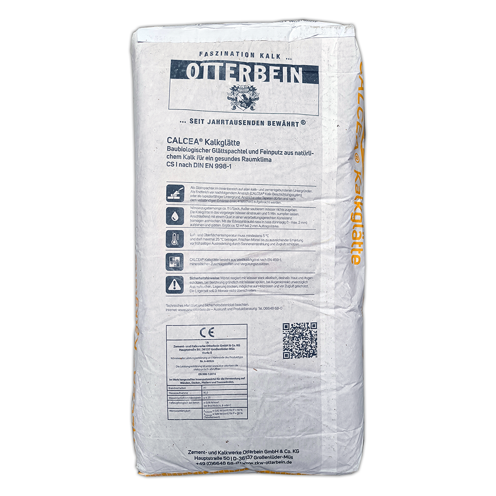 CALCEA Kalkglätte | 25kg ist ein werksgemischter Kalkputz der Firma Otterbein. Die Kalkglätte ist optimal als Glättspachtel im Innenbereich auf kalk- oder zementgebundenen Untergründen geeignet. Ebenso als Endfinish vor nachfolgendem Anstrich oder als tapezierfähiger Untergrund. Sie ist hoch diffusionsoffen sowie feuchte- und klimaregeulierend und sorgt so für ein behagliches Raumklima. Durch ihre hohe Alkalität wirkt sie einer Schimmelbildung auf natürliche Weise entgegen.