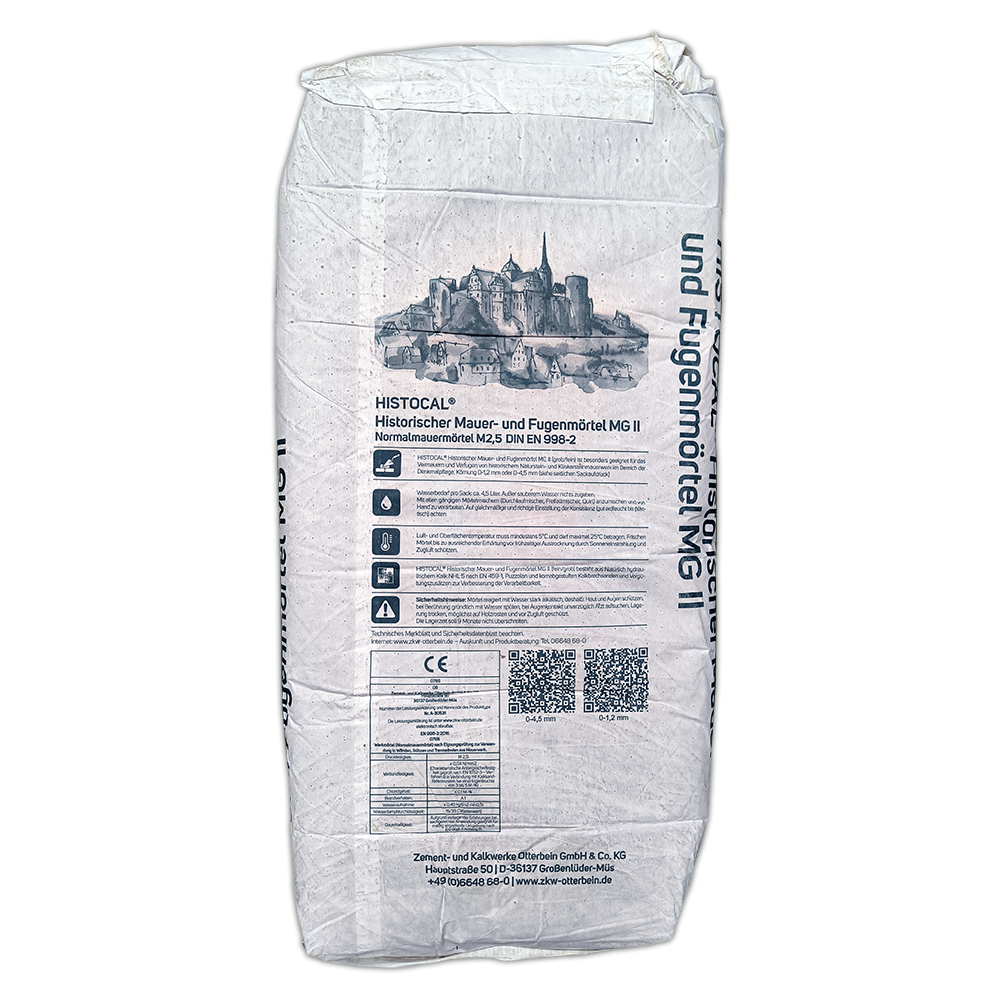 HISTOCAL Historischer Mauer- und Fugenmörtel MGII fein | 25kg ist ein hochwertiger, zementfreier werksgemischter Kalkmörtel der Firma Otterbein zum Vermauern und Verfugen von historischem Natursteinmauerwerk. Die Sieblinie der verwendeten kornabgestuften Kalkbrechsande ist an historische Befunde angelehnt.