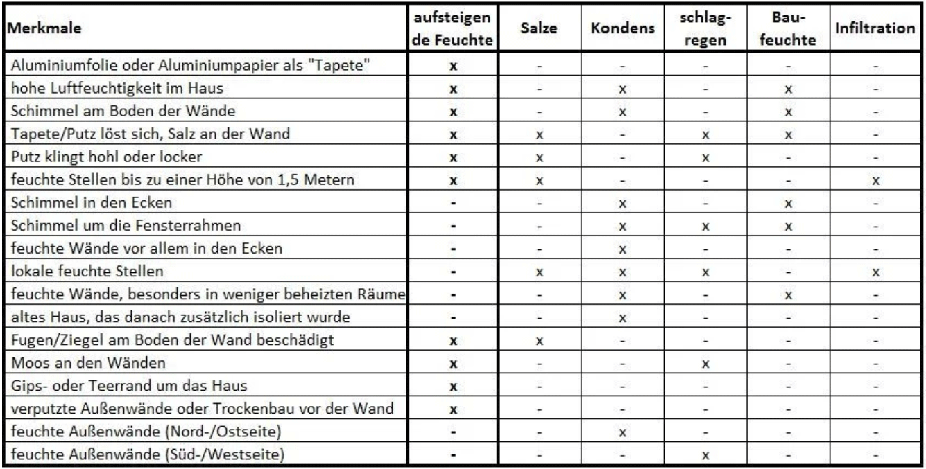 Eine Reihe von Merkmalen kann eine Vorstellung davon geben, was das Feuchtigkeitsproblem verursacht hat: durch aufsteigende Feuchtigkeit, durch Salze in der Wand, durch Kondensation, Schlagregen, Baufeuchtigkeit oder durch Infiltration.