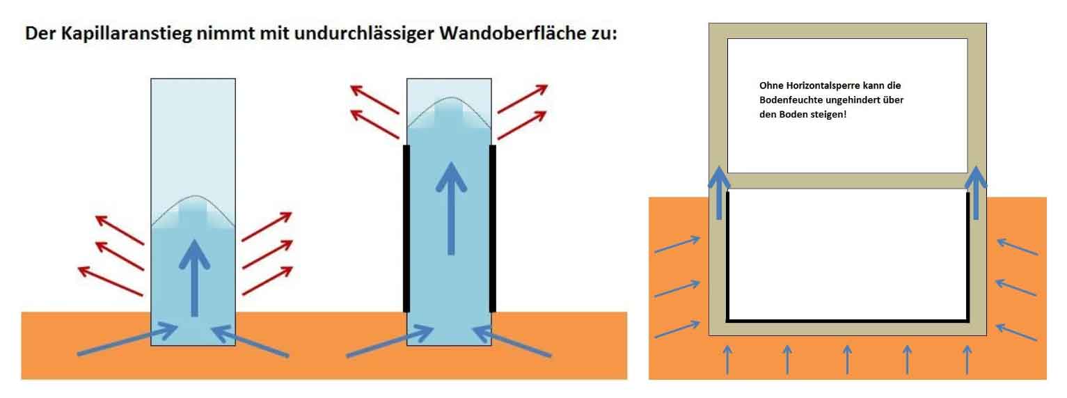 10. War die Lösung effektiv? Ein wasserdichtes Wandoberfläche ohne horizontalsperre fängt die Feuchtigkeit ein, so dass die Feuchtigkeit noch höher steigt! Siehe Zeichnung unten.