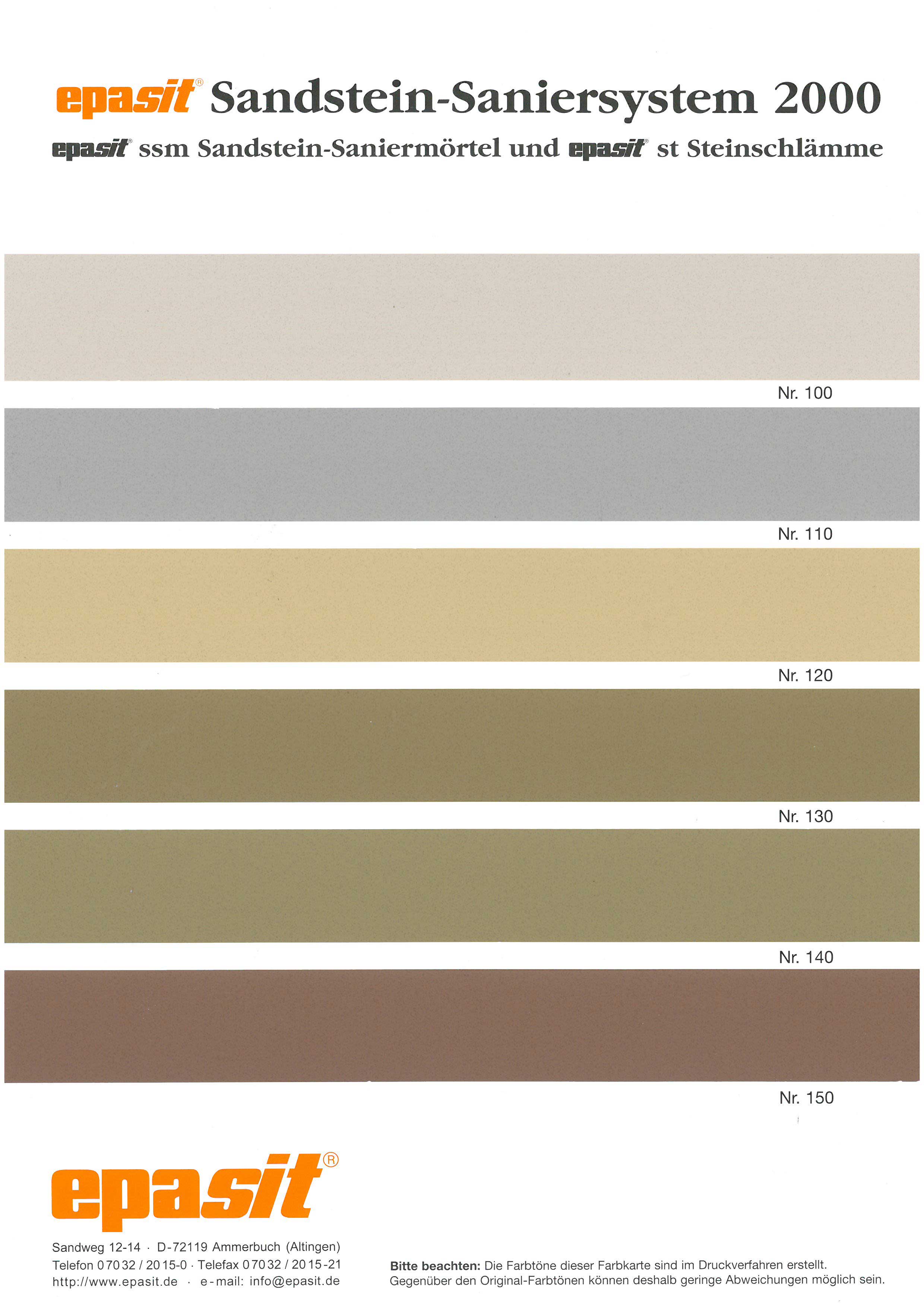 Sandstein-Saniermörtel epasit ssm ist rein mineralisch. Er ist in "Natur" und 6 anderen, untereinander mischbaren Sandsteinfarben lieferbar.
